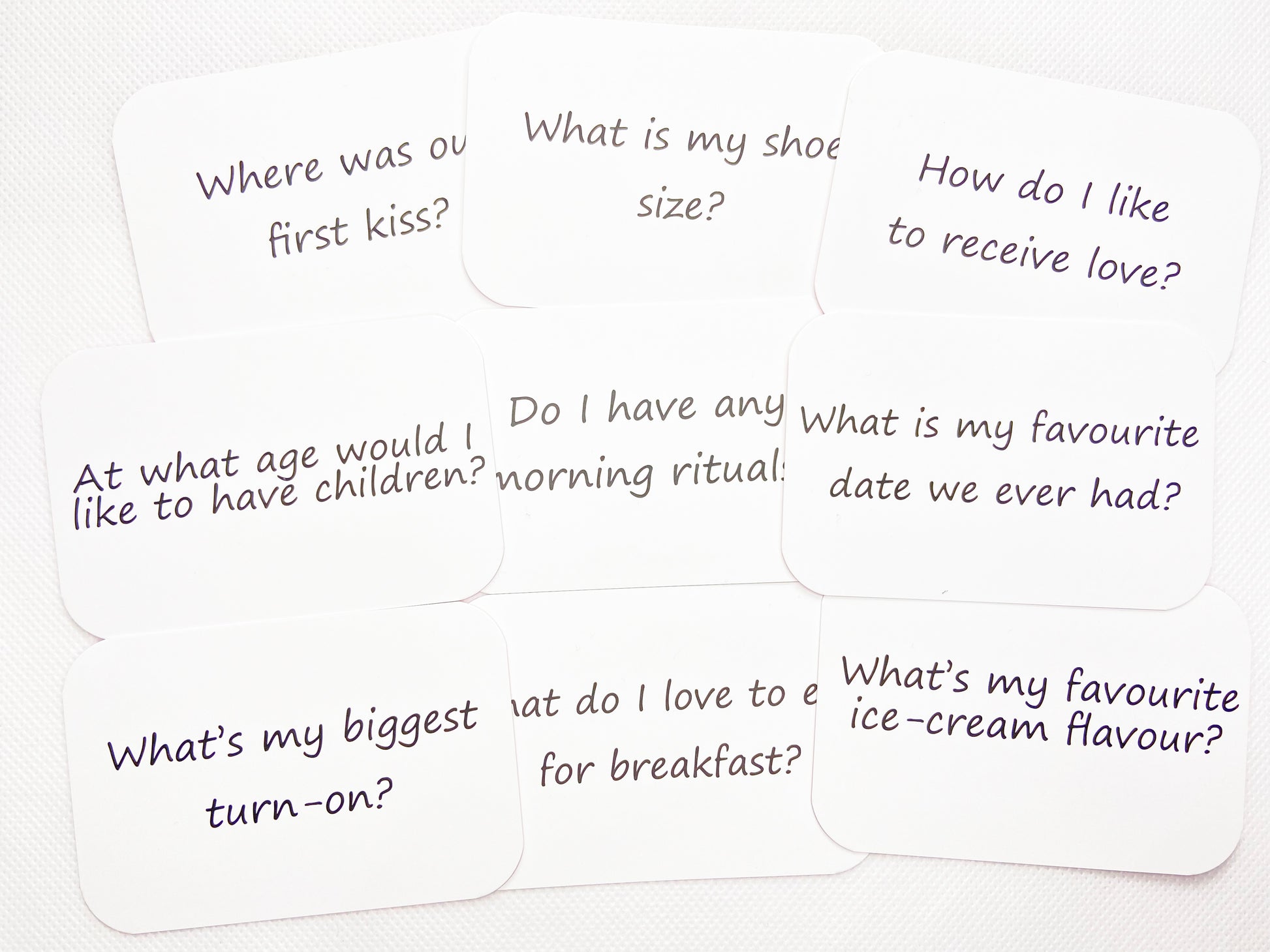 ❤️Learn Each Other’s Love Languages - Guess your partner’s answer and learn some new things about them! Discover mutual interests, pet peeves, past experiences and present plans without the awkward ask-and-I’ll-tell conversation.